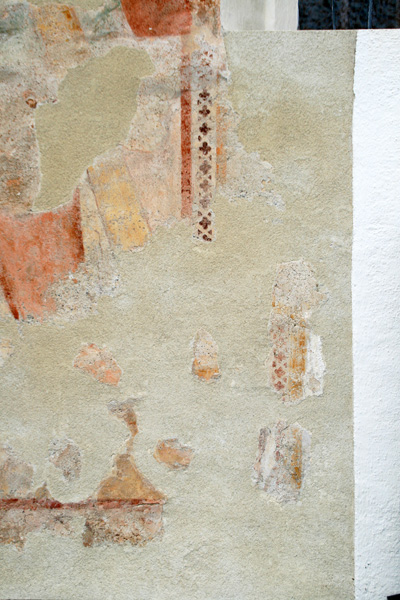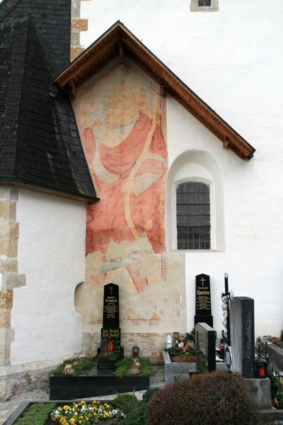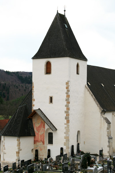 Die beeindruckende, aus dem 12. Jahrhundert stammende Kirche wird von Friedhof und Mauer umgeben und steht hoch über dem Ort an der nach Bad Erlach führenden Straße. Früher war die Mauer mit mehreren Türmen, der Zugang mit einem Vorwerk versehen. Sämtliche Wehreinrichtungen waren bereits in den 1820er Jahren nichtmehr vorhanden. | |