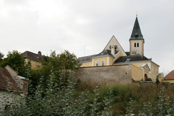 Die zu Beginn des 20.Jahrhunderts zerstörte Kirche war von einer weitläufigen Wehrmauer mit Schießscharten umgeben und bildete zusammen mit dem Pfarrhof eine Wehranlage. Bereits Anfang des 18.Jahrhunderts wurde der Pfarrhof umgestaltet und mit dem Neubau der Kirche ging auch hier die Wehrhaftigkeit verloren. | |