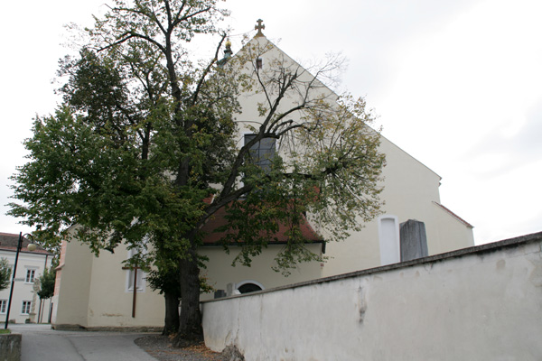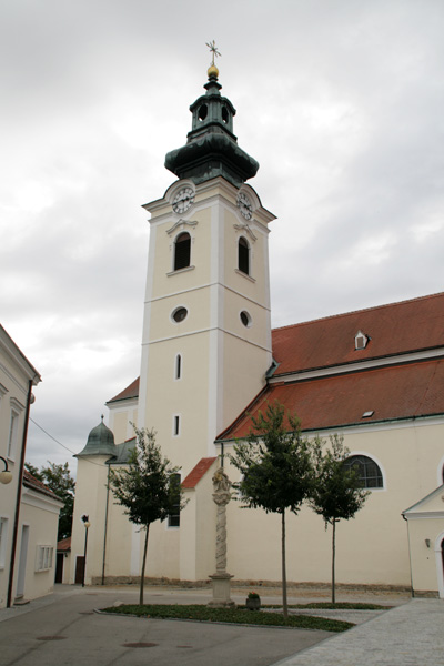 Die Kirche wurde am südöstlichsten Rand des Wagrams errichtet und bietet somit an zweit Seiten einen natürlichen Schutz. Die Zufahrt zum Ortszentrum erfolgt über einen alten Hohlweg, der sich als Graben fortsetzt und die Zugangsseite zur Kirche schützte. Der Kirchturm war dem Ortwappen von 1497 nach ein Wehrturm. | |
