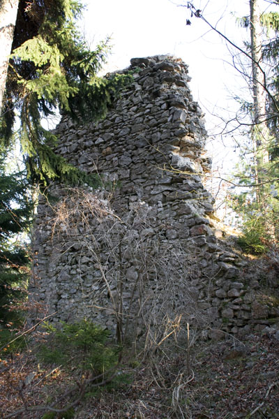 Mauerreste der Ruine Luegg (auch Lug ins Land) am Gipfel des Hausberges Anfahrt: Straße Semrich Richtung Friesach, Abzweigung nach Taschen bis zum Jägerhof Parken: geringe Parkmöglichkeit am Straßenrand. Weg: Vom Jägerhof nördlich um das Grundstück herum, weiter in den Wald. Wenn man sich nicht vergangen hat. stösst man auf einen Forstweg, der bei einem Hochstand endet, dort links. Bei einer Gabelung links (Pfad) zur Ruine Forchtenberg oder rechts (Forstweg) bis zum Ende und dann ohne Weg bis zum höchsten Punkt zur Ruine Luegg. Zugang: Ruine Forchtenberg ganzjährig möglich, Ruine Luegg im Sommer verwachsen zuletzt besucht: 28.03.2015